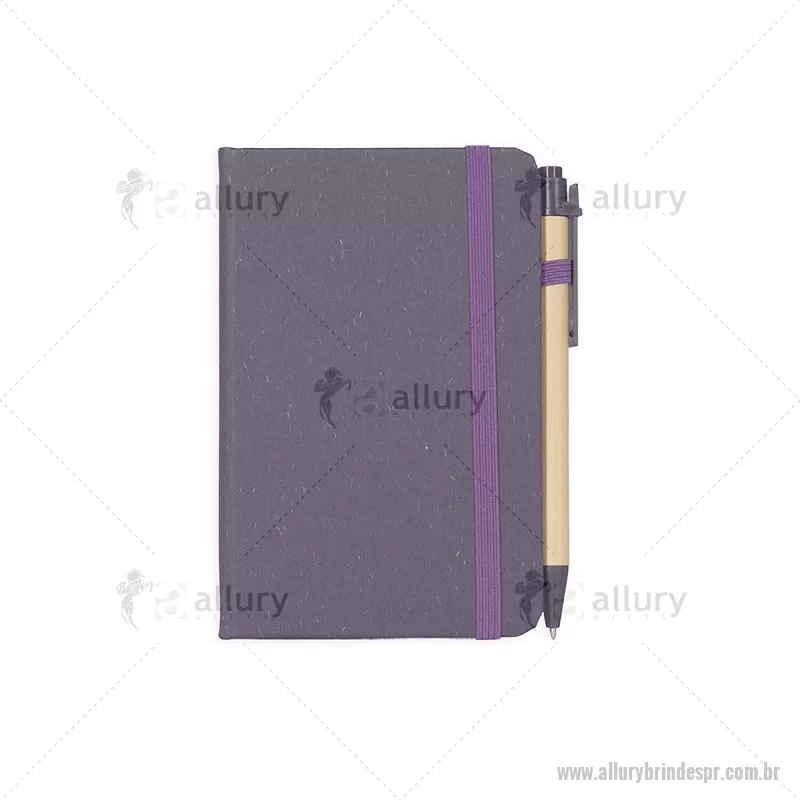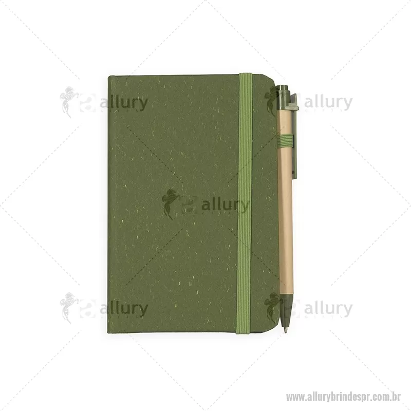 Caderneta ecológica com capa dura revestida em fibra de palha de trigo, contendo cerca de 80 folhas pautadas, duas folhas de guarda, elástico para fechamento e porta-canetas. Acompanha caneta esferográfica azul 1,0 mm com corpo em papelão, clip e acionamento por clique. - - ALLPRBLC270