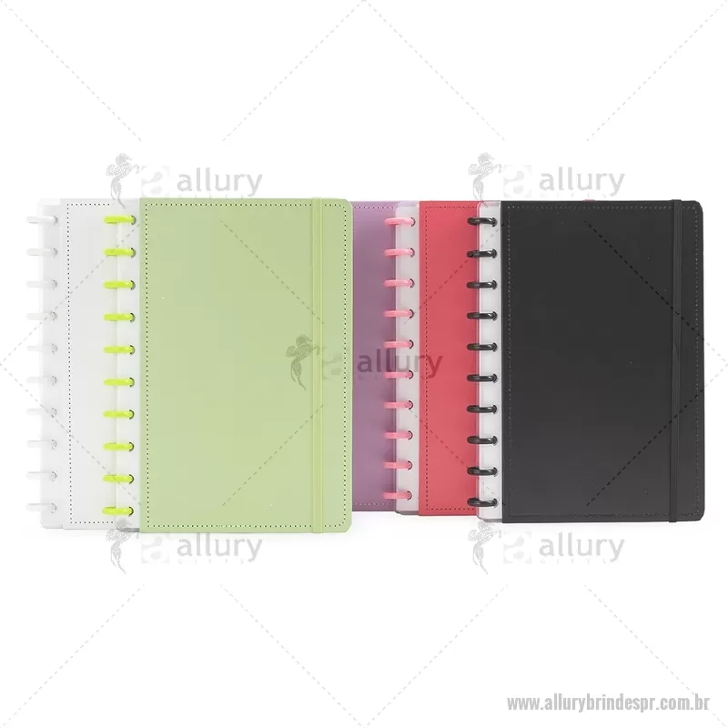 Caderno com capa dura em papelão, elástico para fechamento e encadernação em discos plásticos reposicionáveis, que permitem adicionar ou remover folhas compatíveis com praticidade. Possui aproximadamente 80 folhas brancas pautadas, ideal para anotações e organização do dia a dia. - - ALLPRCAD040