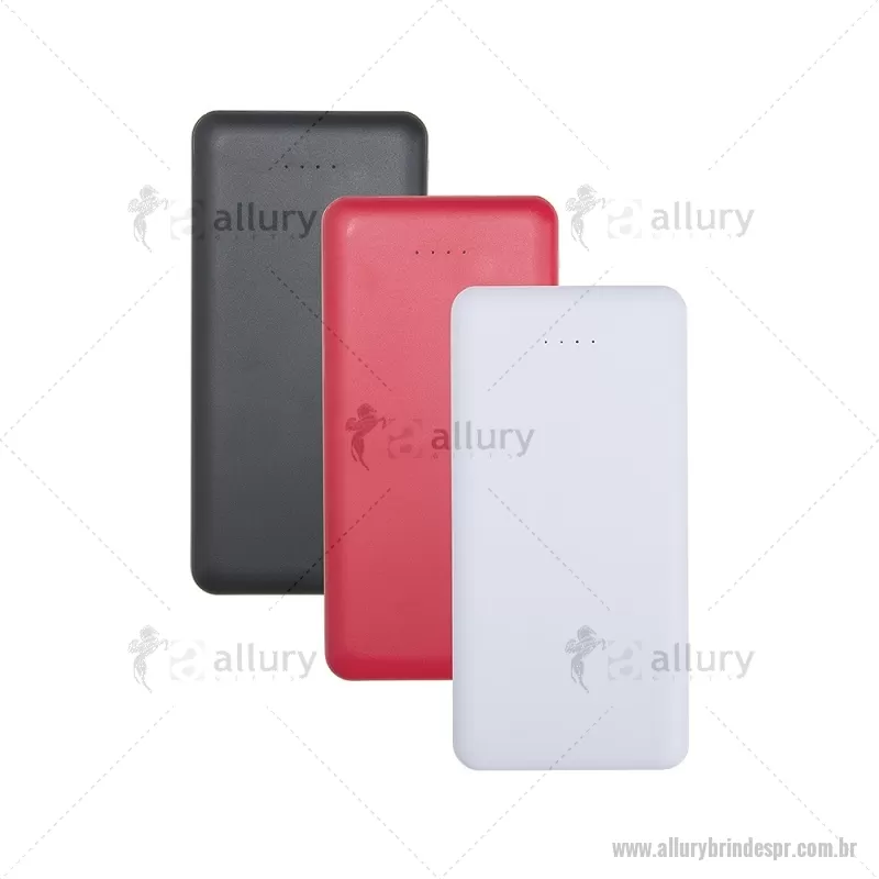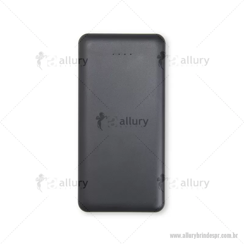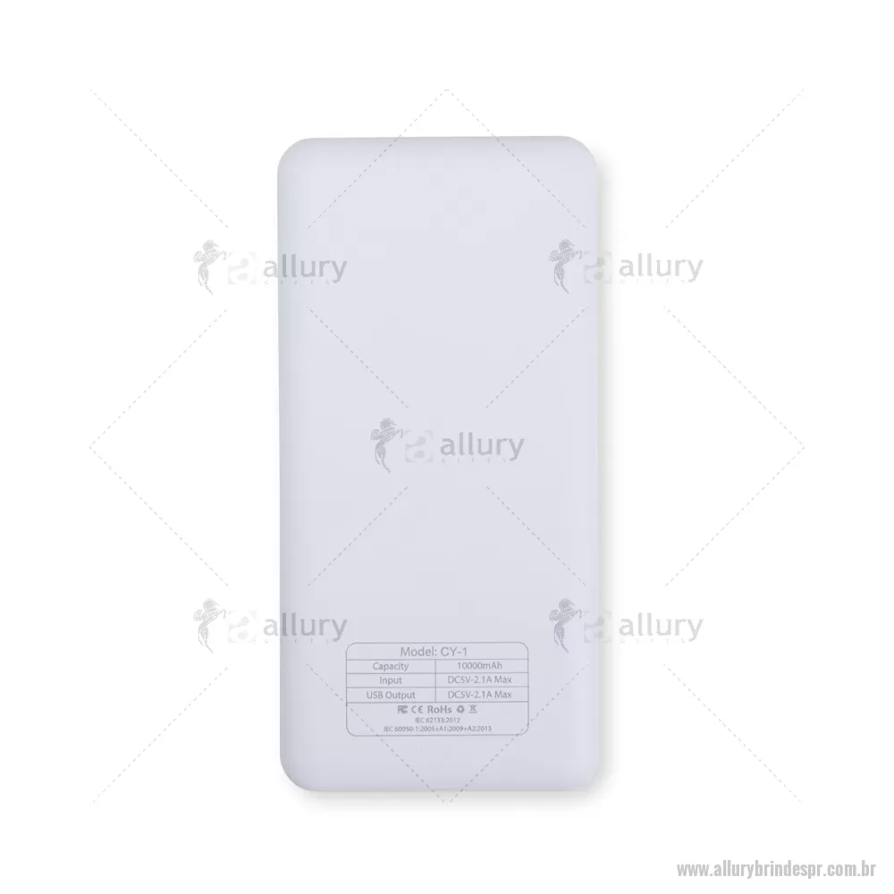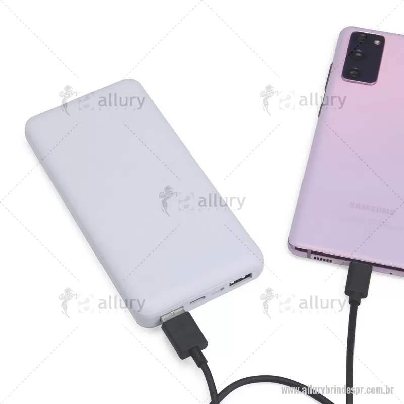 Power Bank 10.000mAh com Indicador LED Descrição: Power bank com estrutura em plástico com potência de 10.000mAh e quatro luzes de LED para indicar o status de carga do próprio carregador portátil. Possui quatro entradas diferentes: duas portas USB, uma porta Micro USB e outra USB-C. Altura : 14 cm x Espessura : 1,5 cm x Comprimento : 7 cm Peso aproximado (g): 243 - - ALLPRTEC531