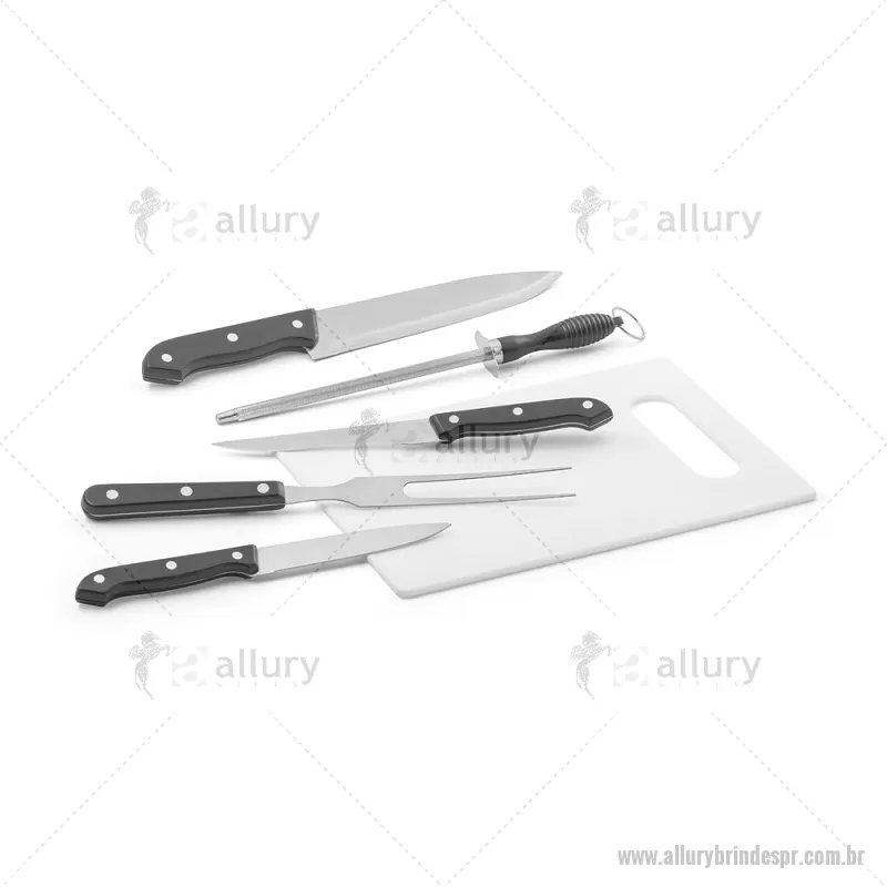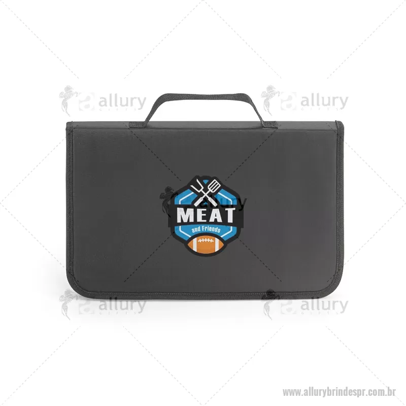 Kit churrasco em estojo de nylon 210D com tábua em PP e 5 utensílios em aço inox e PP: faca chefe, faca boning, faca pequena, garfo e afiador. Certificação EU Food Grade. Estojo: 350 x 230 x 40 mm | Tábua: 283 x 192 x 5 mm - - ALLPRKCH056