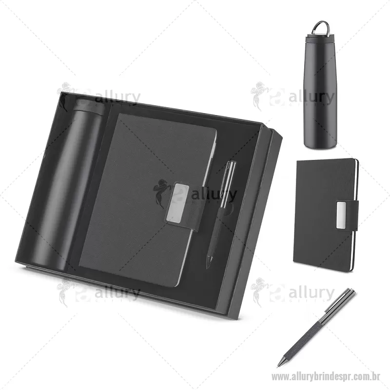 Kit escritório Caderno, Garrafa e Caneta Metalica Conjunto composto por caderno em material RPET com fechamento magnético,com 100 páginas, caneta modelo twist com detalhe em tecido RPET preto e garrafa de parede dupla em inox (304 interno e 201 externo), com capacidade de 550ml. Acompanha caixa presenteável. Peso do Produto: 0,256kg (Caderno) Peso do Produto: 0,277kg (Garrafa) Peso do Produto: 0,019kg (Caneta) Peso do Produto: 0,491kg (Caixa) Dimensão do Produto: 23,5x7,1cm (Garrafa) Dimensão do Produto: 21x14,5cm (Caderno) Dimensão do Produto: 7,6x30x24,7cm (Estojo presenteável) - - ALLPRKES083