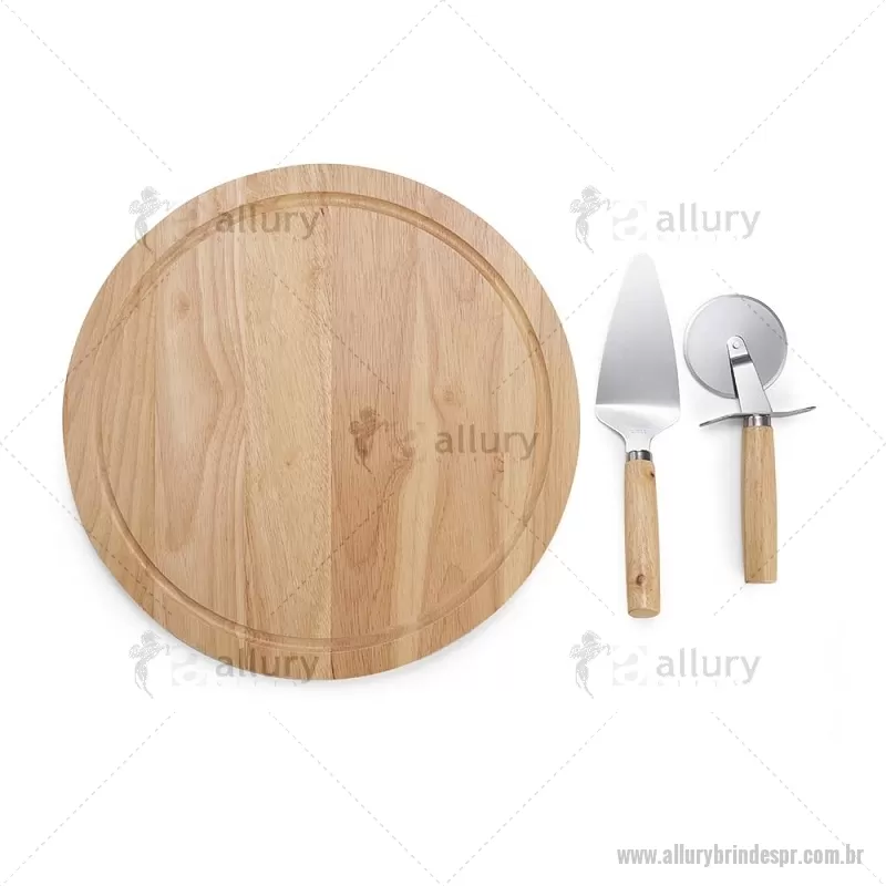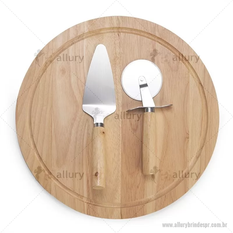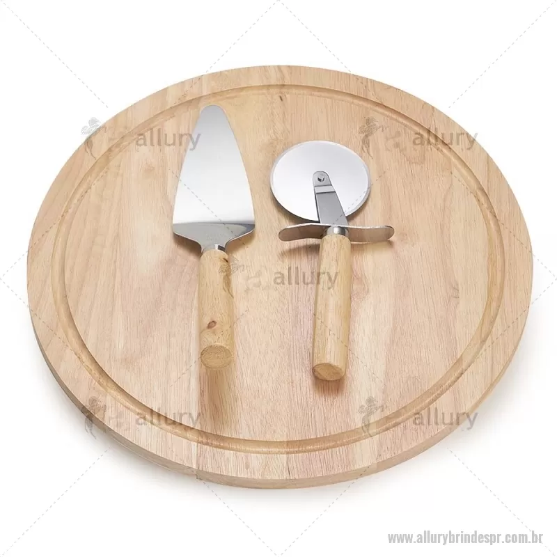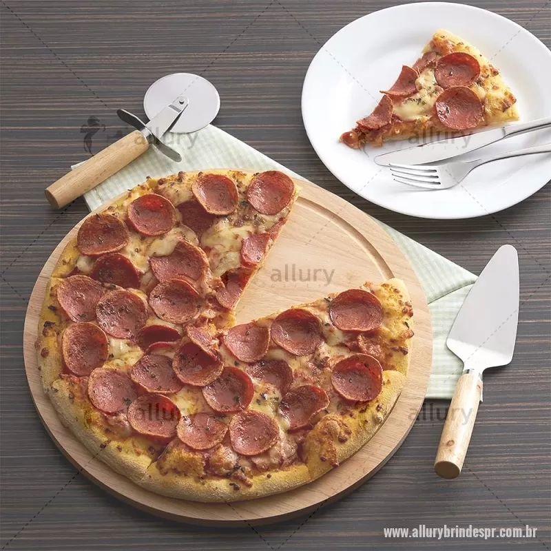 Kit pizza 3 peças, contém: tabua de bambu com canaleta, espátula de inox com cabo de bambu e cortador de pizza de inox com cabo de bambu. Altura : 32,4 cm x Largura : 32,4 cm x Espessura : 1,3 cm Peso aproximado (g): 887 Gravação em Laser. - - ALLPRKPZ004