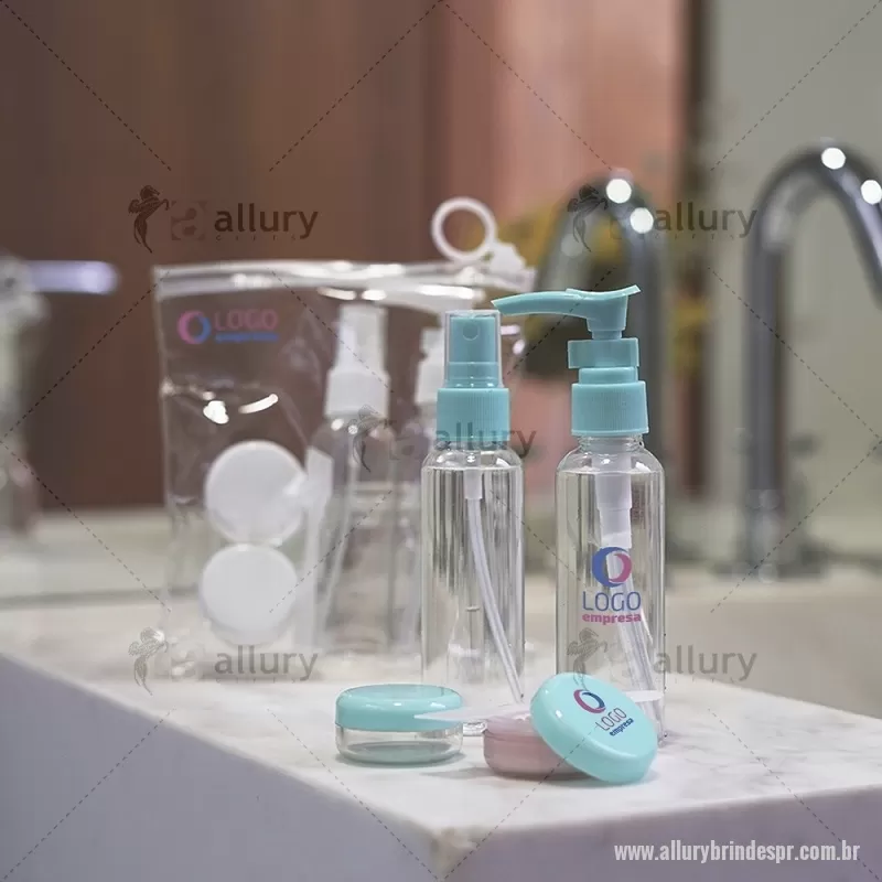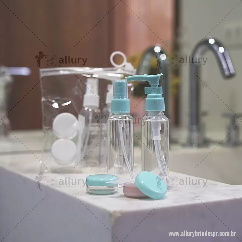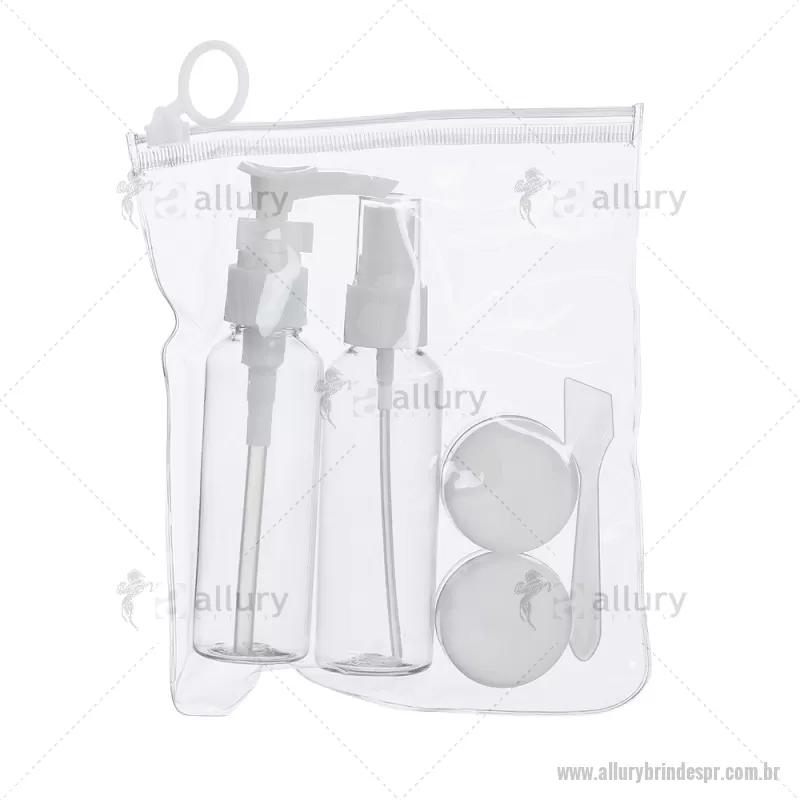 Kit Viagem 5 Peças Descrição: Kit viagem 5 peças em estojo ziplock. Contém frasco de 70ml com tampa spray; frasco de 70 ml com tampa pump; 2 potes de 10ml com tampa rosqueável e mini espátula fosca. Frascos plásticos e estojo em pvc com puxador plástico. Altura : 17,2 cm x Largura : 14,5 cm Peso aproximado (g): 61 - - ALLPRKVG017