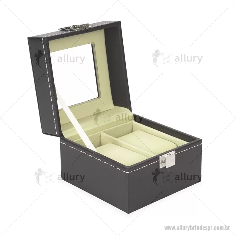 Porta relógios com acabamento externo em couro sintético à base de PVC e interior revestido em veludo macio. Possui duas divisórias com almofadas removíveis para melhor acomodação das peças, tampa com visor em vidro que facilita a visualização e trava de segurança que garante o fechamento adequado do estojo. Ideal para organizar e proteger relógios com elegância. - - ALLPRPREL001