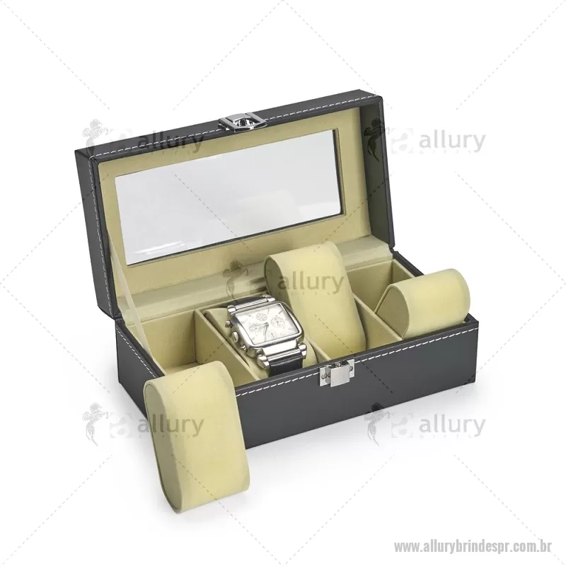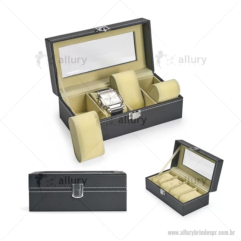 Porta-relógios com acabamento em couro sintético em PVC e interior forrado em veludo. Possui quatro compartimentos com almofadas de espuma removíveis, visor superior em vidro e trava de segurança, ideal para organizar e proteger relógios com elegância. - - ALLPRPREL003