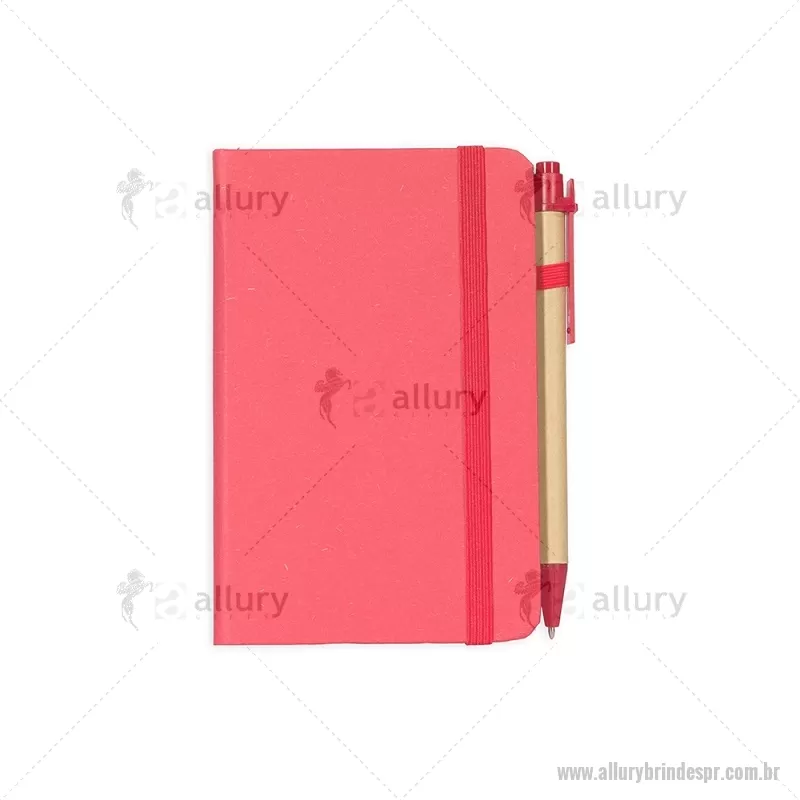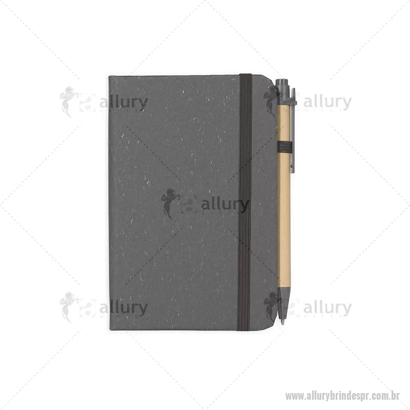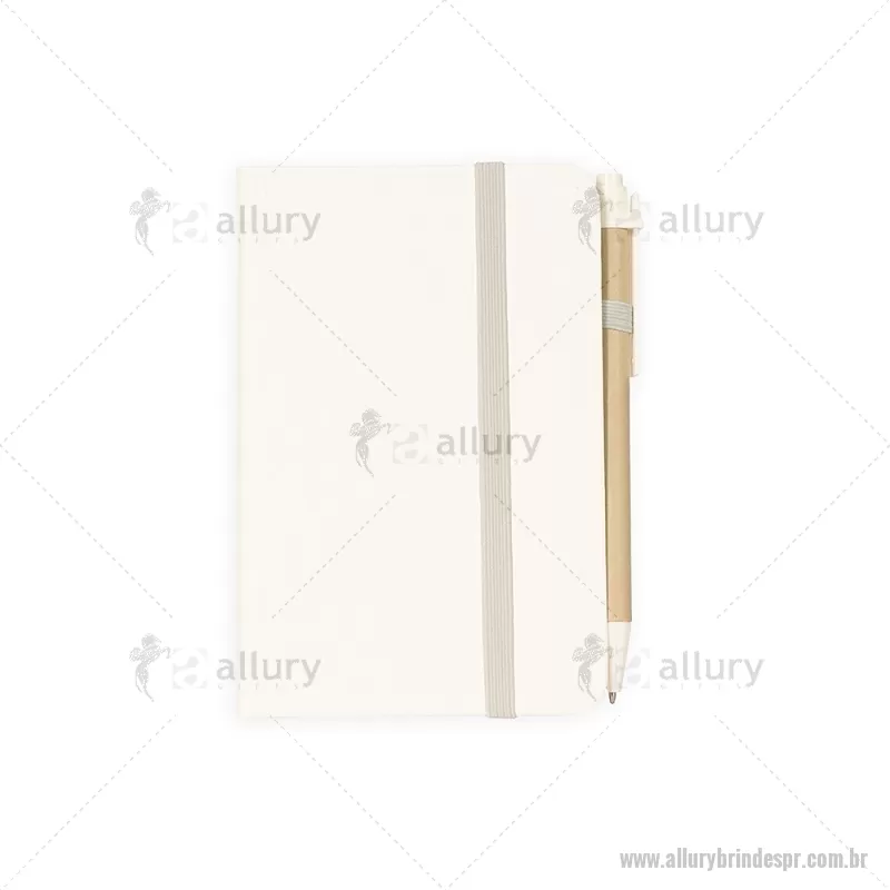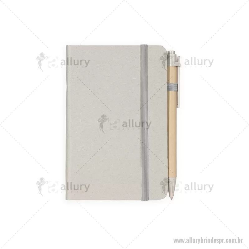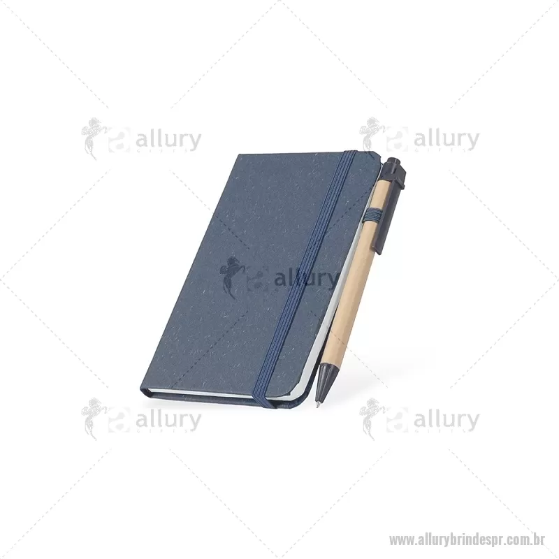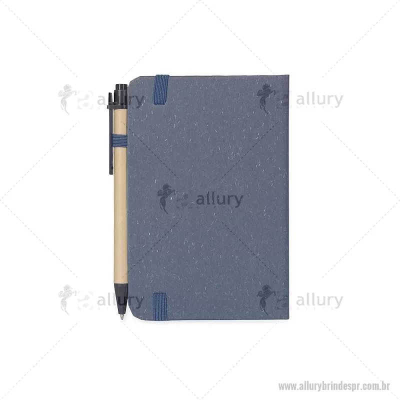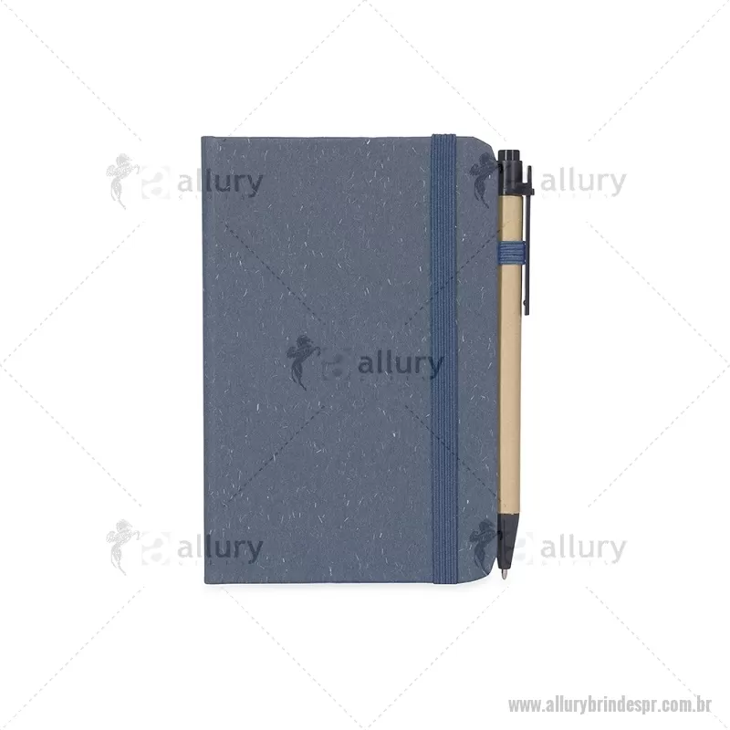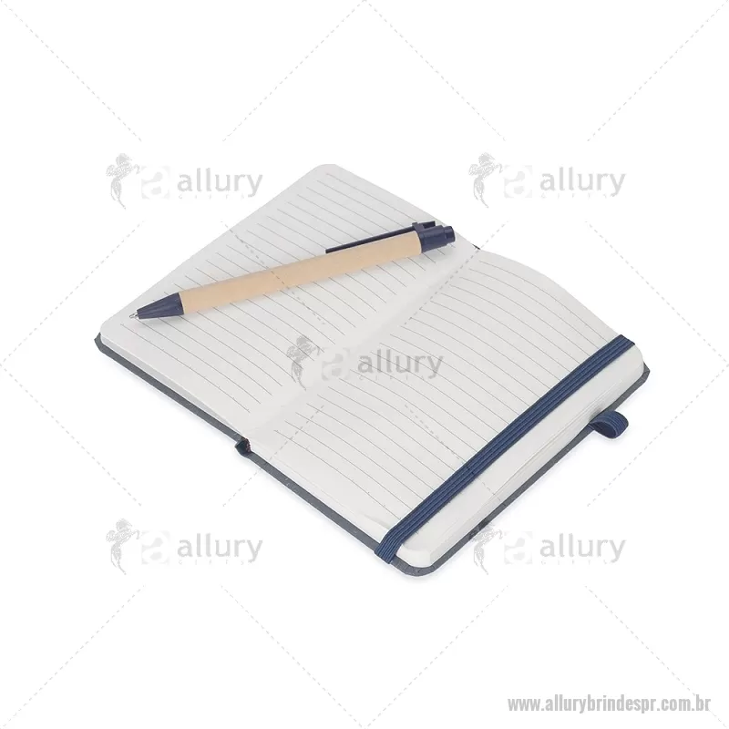 Caderneta ecológica com capa dura revestida em fibra de palha de trigo, contendo cerca de 80 folhas pautadas, duas folhas de guarda, elástico para fechamento e porta-canetas. Acompanha caneta esferográfica azul 1,0 mm com corpo em papelão, clip e acionamento por clique. - - ALLPRBLC270
