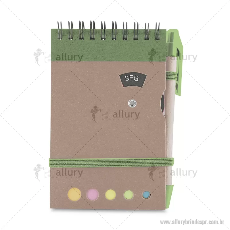 Mini caderno A6 com caneta com capa em papel kraft, com 70 folhas pautadas e blocos adesivos (sticky notes) coloridos. Acompanha disco rotativo na capa com os dias da semana e caneta produzida em papelão reciclado com detalhes em plástico e escrita em azul. Peso do Produto: 0,088kg (Caderno) Peso do Produto: 0,004kg (Caneta) Dimensão Produto: 14,5x9cm (Caderno) Dimensão do Produto: 3,6xø0,9cm (Caneta) - - ALLPRBLC275