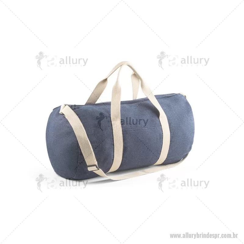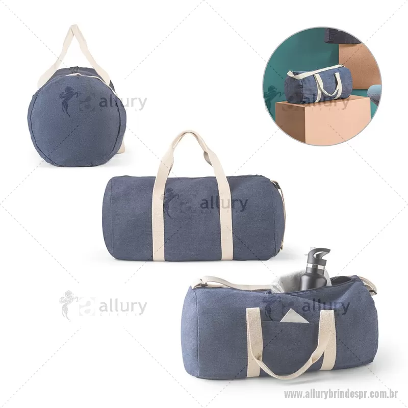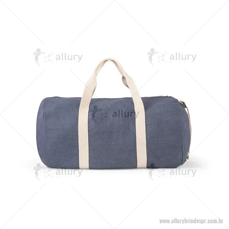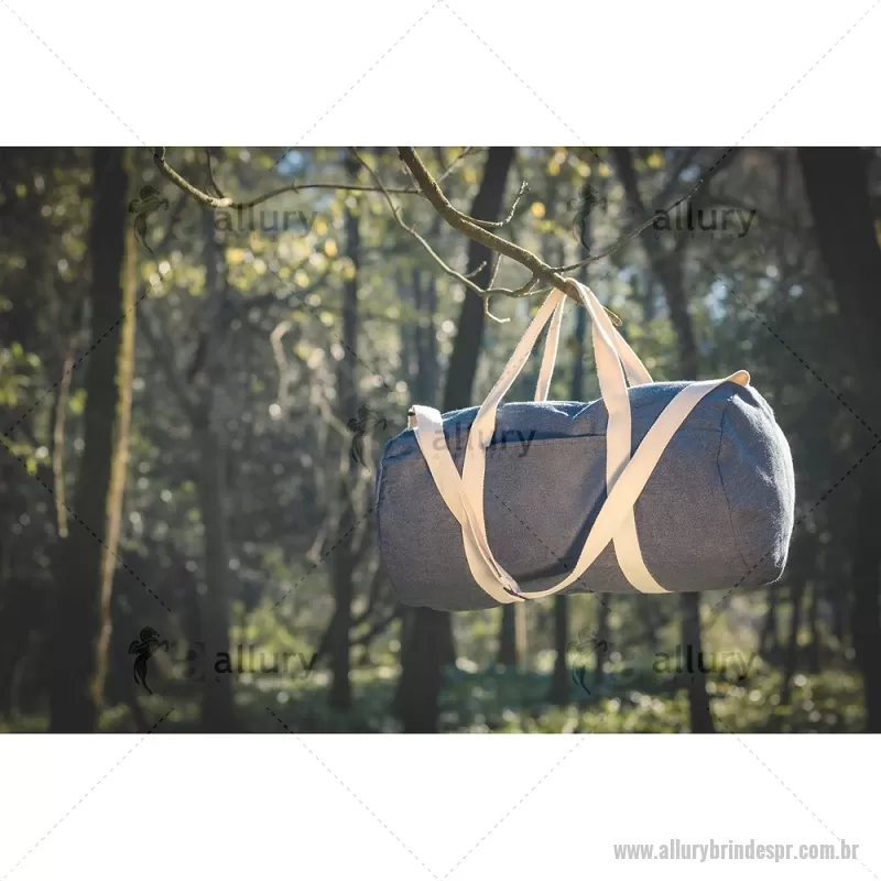 Bolsa esportiva ou viagem em denim reciclado (300 g/m²) Sacola esportiva ou viagem em denim reciclado (300 g/m²). Contém bolso frontal, fecho duplo e costuras reforçadas. Possui alças em webbing de algodão e alça de ombro ajustável até 130cm. Capacidade até 25 L. Ø260 x 480 mm Peso do Produto (g.): 249 - - ALLPRBOL043