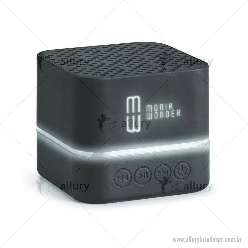 Caixa de som. ABS. Acabamento emborrachado. Luz LED no seu interior. Transmissão por bluetooth. Personalizável com logotipo iluminado. Autonomia: > 2h. Bateria: 300mAh. Inclui cabo USB - micro USB para carregamento. Fornecida em caixa. 59 x 59 x 51 mm - - ALLPRTEC401