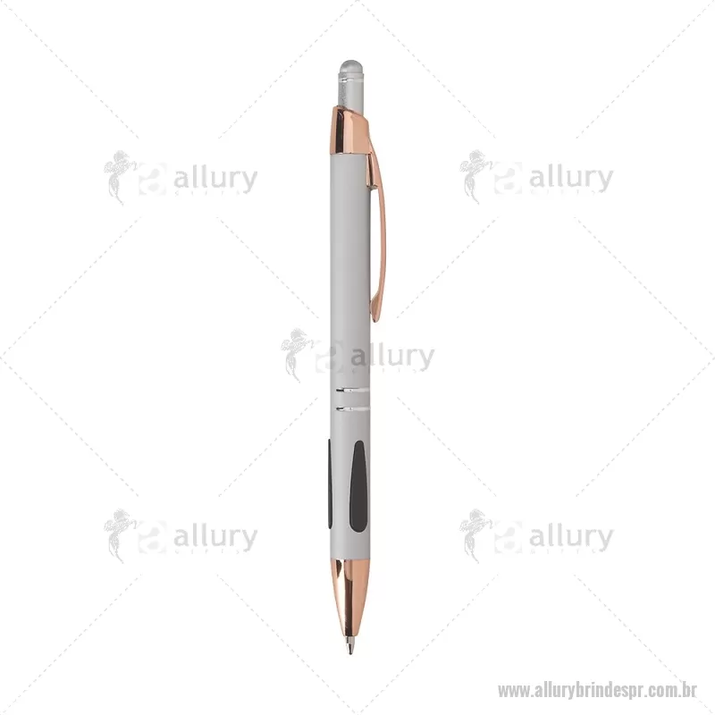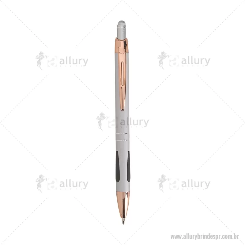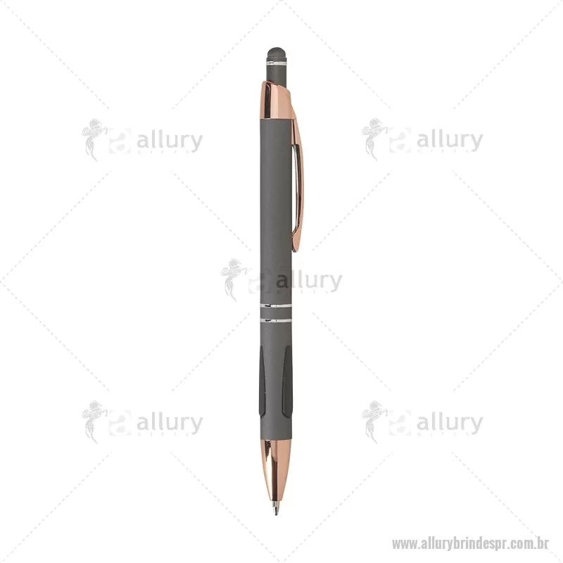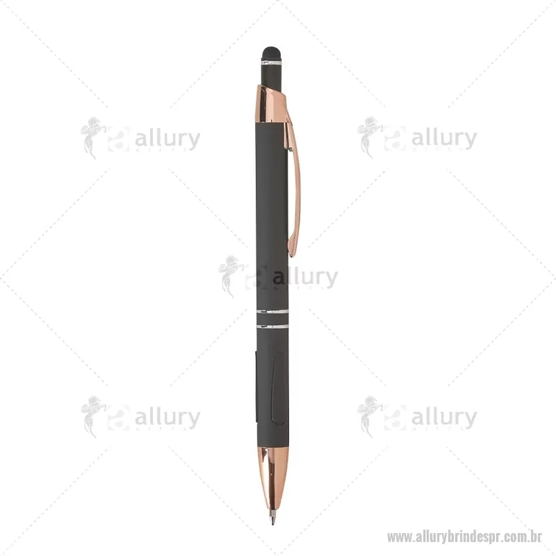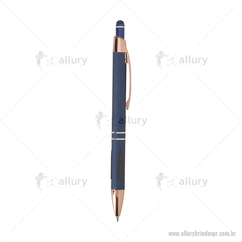 Caneta em metal com detalhes emborrachados, carga esferográfica azul 1,0 mm e acionamento por clique. Possui ponta touch emborrachada para uso em telas sensíveis ao toque, unindo escrita e praticidade em um só item. - - ALLPRCMT295