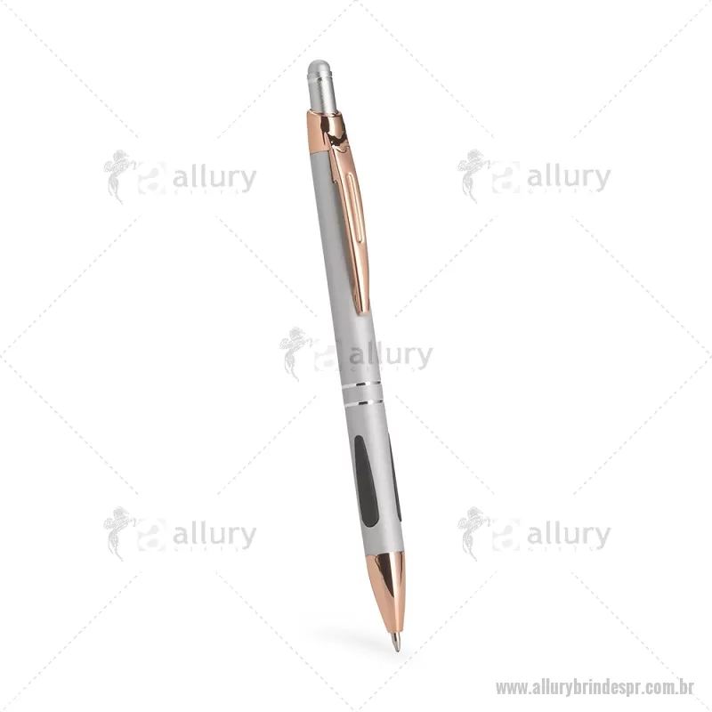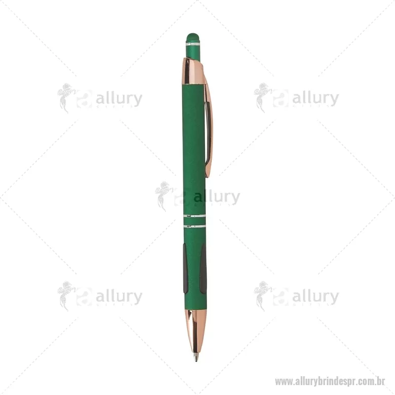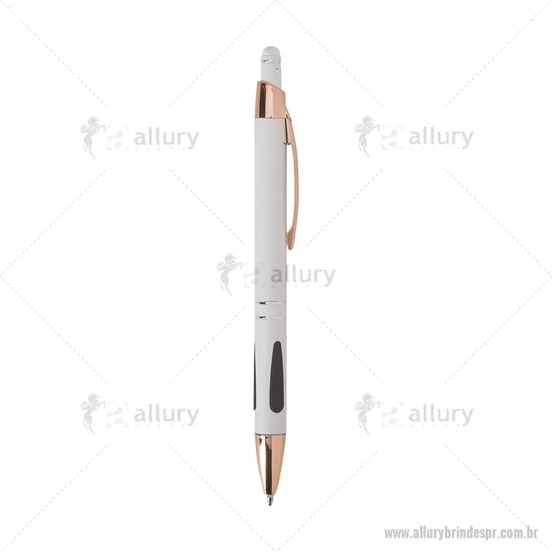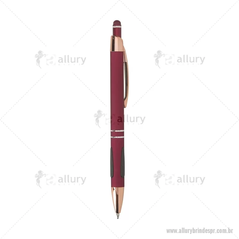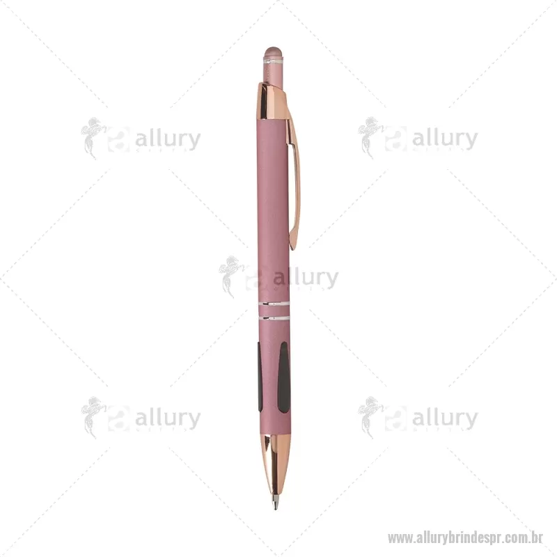 Caneta em metal com detalhes emborrachados, carga esferográfica azul 1,0 mm e acionamento por clique. Possui ponta touch emborrachada para uso em telas sensíveis ao toque, unindo escrita e praticidade em um só item. - - ALLPRCMT295