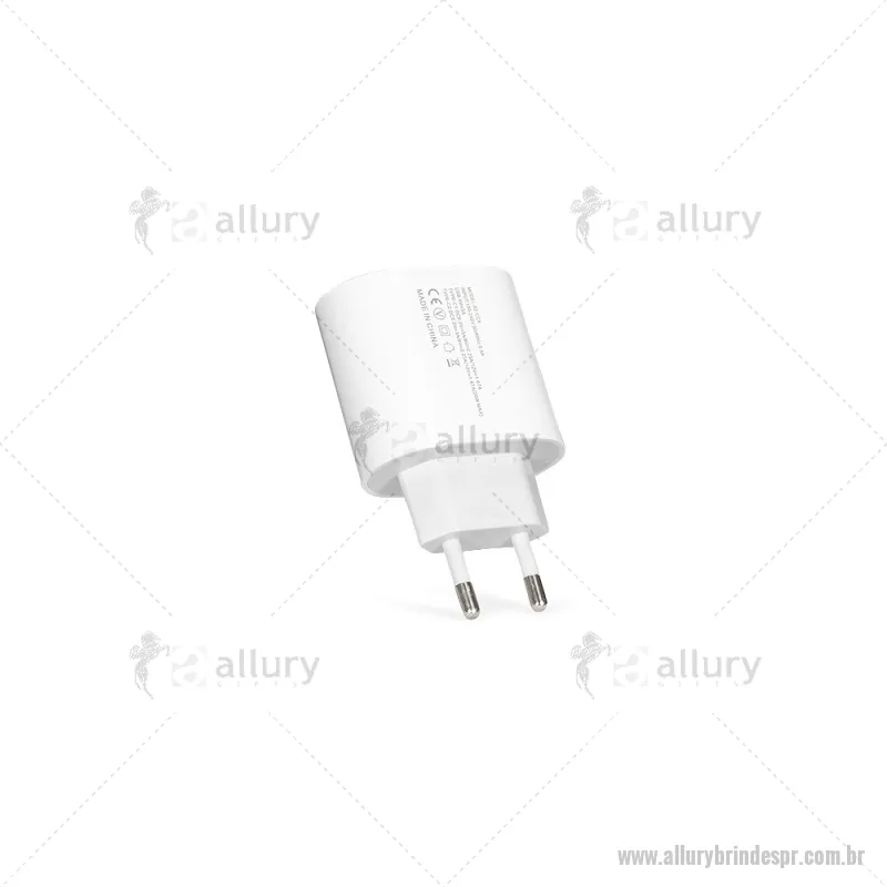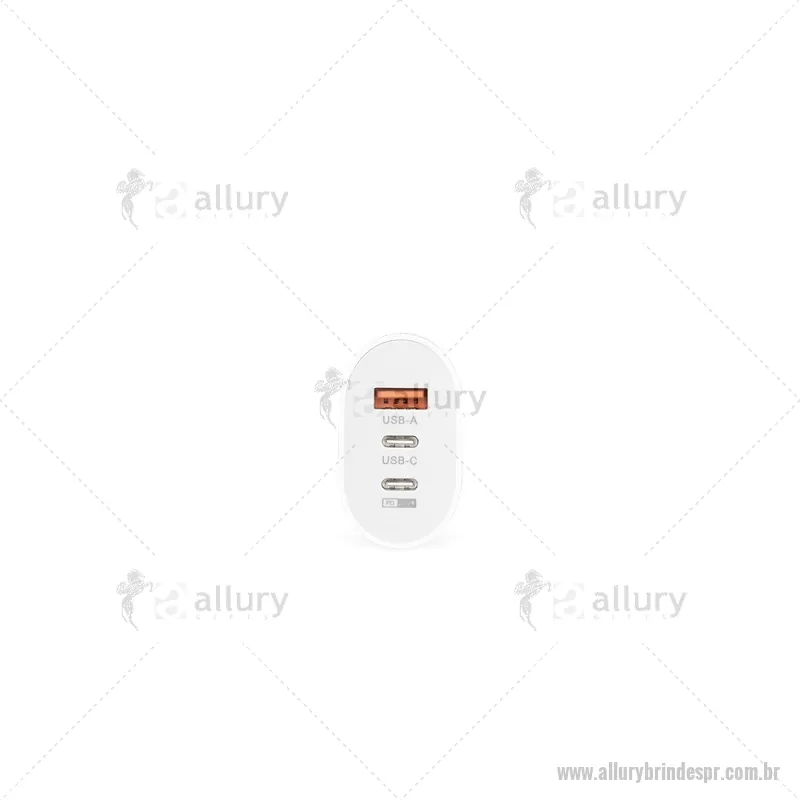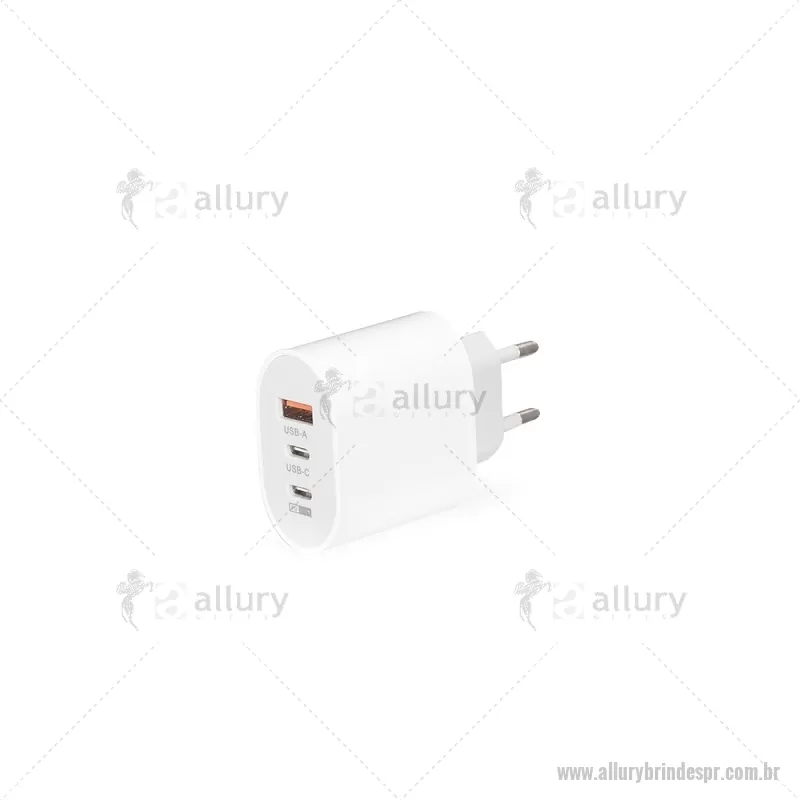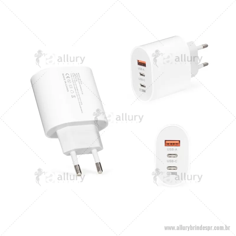 Carregador rápido em plástico leve e compacto, com três portas: uma USB-A e duas USB-C, incluindo uma opção de carregamento rápido de 20W. Ideal para recarregar diferentes dispositivos com praticidade. Cabo USB não incluído. - - ALLPRTEC535