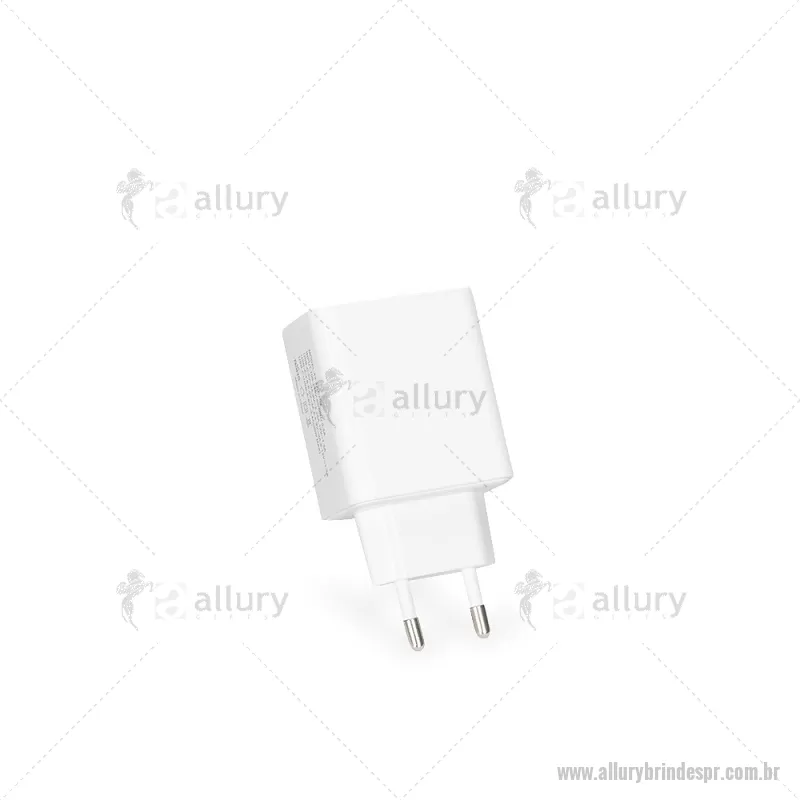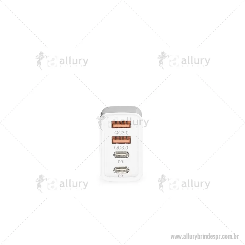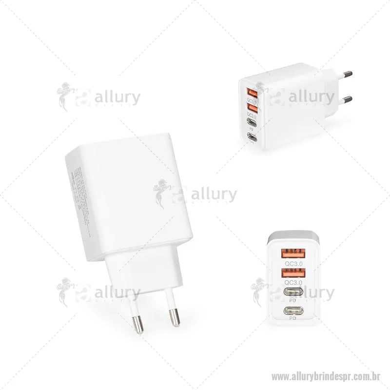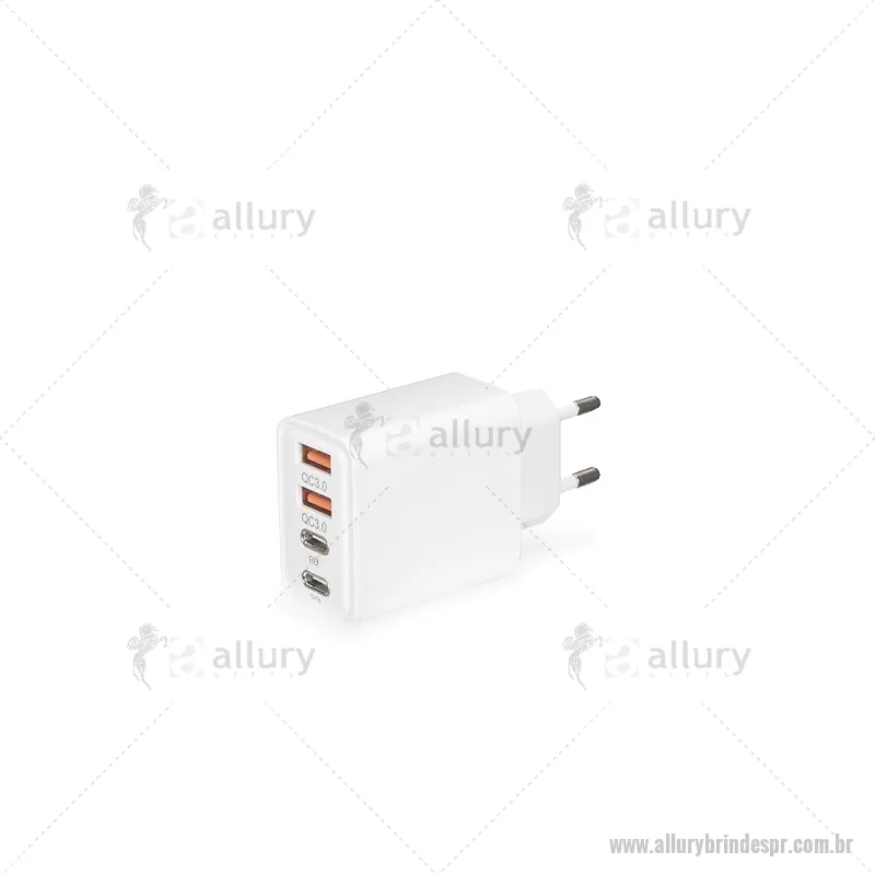 Carregador rápido em plástico leve e compacto, equipado com quatro portas: uma USB padrão, uma USB com tecnologia QC 3.0 para carregamento acelerado e duas entradas USB-C. Prático para uso diário e compatível com diversos dispositivos. Não acompanha cabo. - - ALLPRTEC534