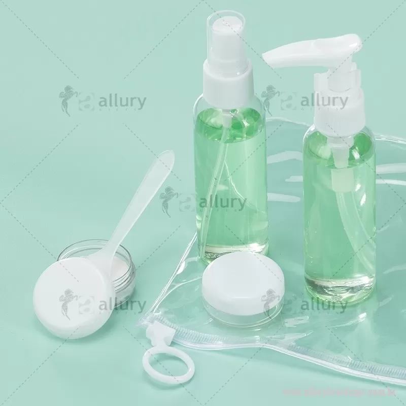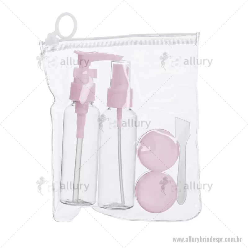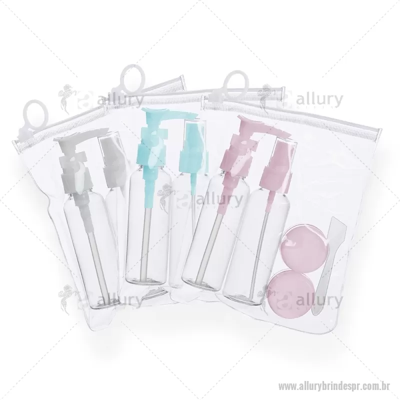 Kit Viagem 5 Peças Descrição: Kit viagem 5 peças em estojo ziplock. Contém frasco de 70ml com tampa spray; frasco de 70 ml com tampa pump; 2 potes de 10ml com tampa rosqueável e mini espátula fosca. Frascos plásticos e estojo em pvc com puxador plástico. Altura : 17,2 cm x Largura : 14,5 cm Peso aproximado (g): 61 - - ALLPRKVG017