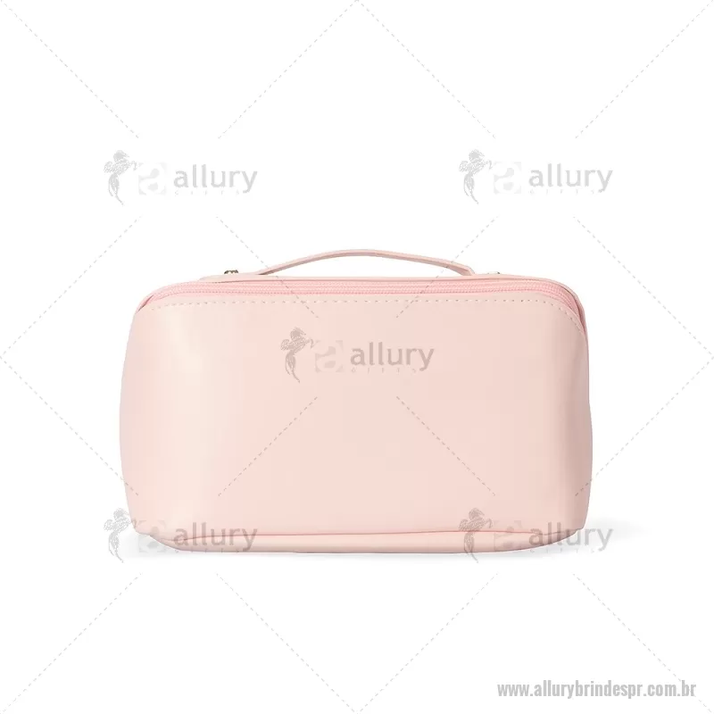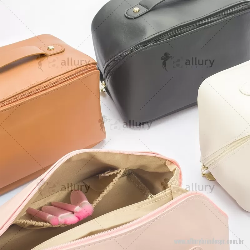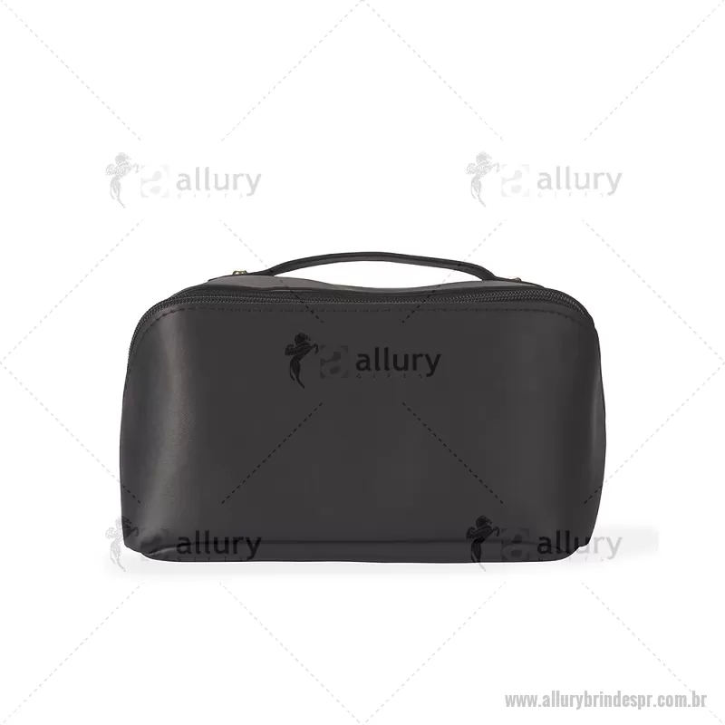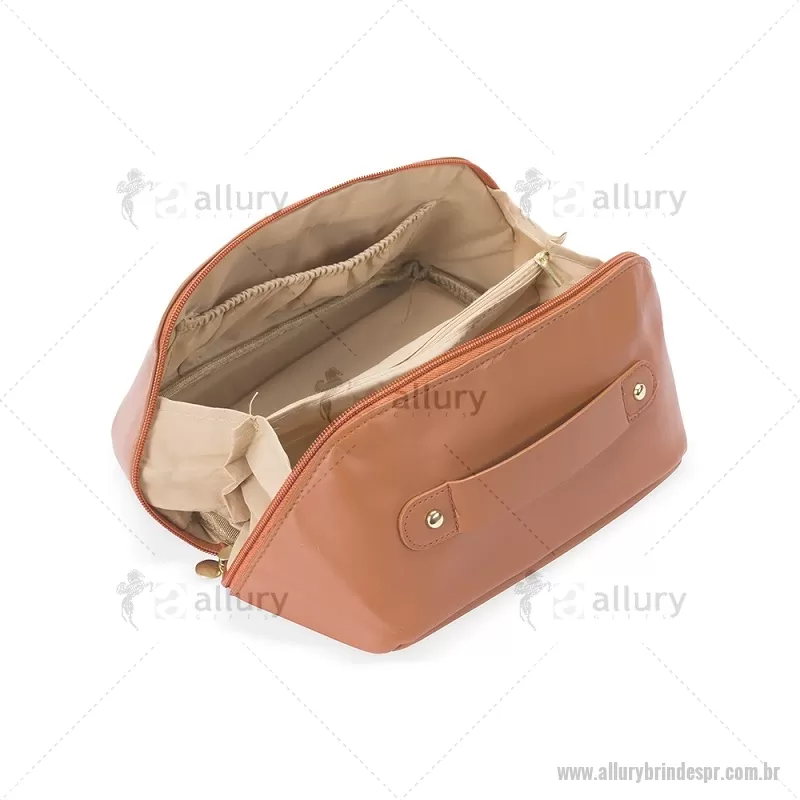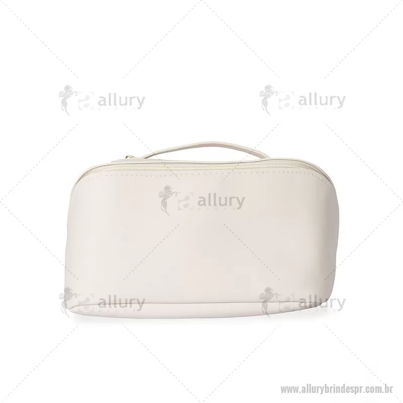 Nécessaire em PU impermeável com abertura em 180 graus, estilo concha, oferecendo fácil visualização dos itens. Possui compartimento interno amplo com dois bolsos laterais e um bolso central com zíper, além de alça para transporte. Ideal para organizar acessórios e produtos pessoais. - - ALLPRNC146
