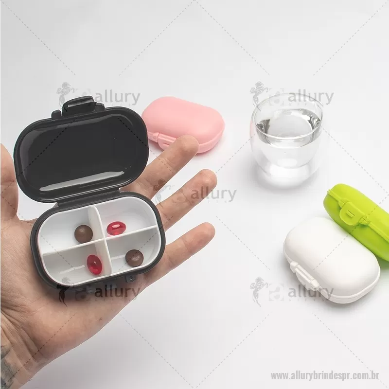 Porta-Comprimidos Plástico Descrição: Porta-comprimidos feito em plástico. Possui compartimento removível com quatro divisórias, o que facilita a limpeza e ajuda a organizar medicamentos ou pequenos objetos. Largura : 6,5 cm x Espessura : 3,7 cm x Comprimento : 9,6 cm Peso aproximado (g): 36 - - ALLPRPCP019