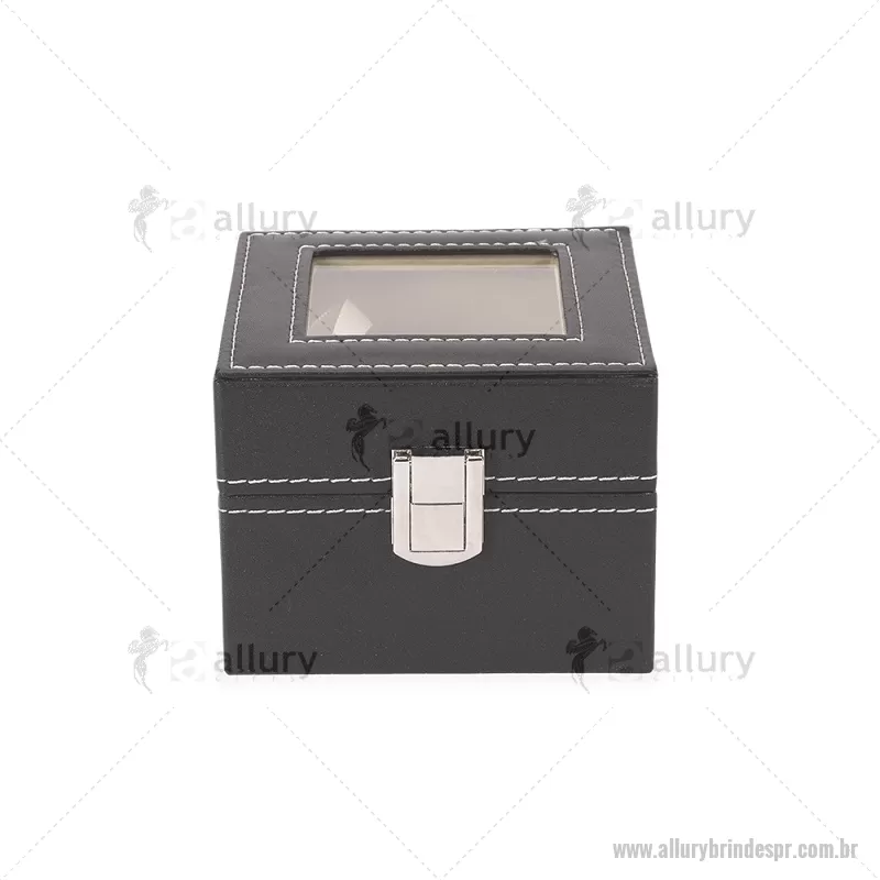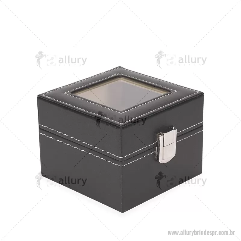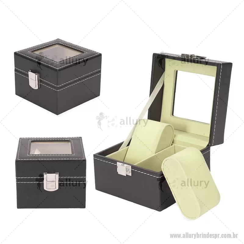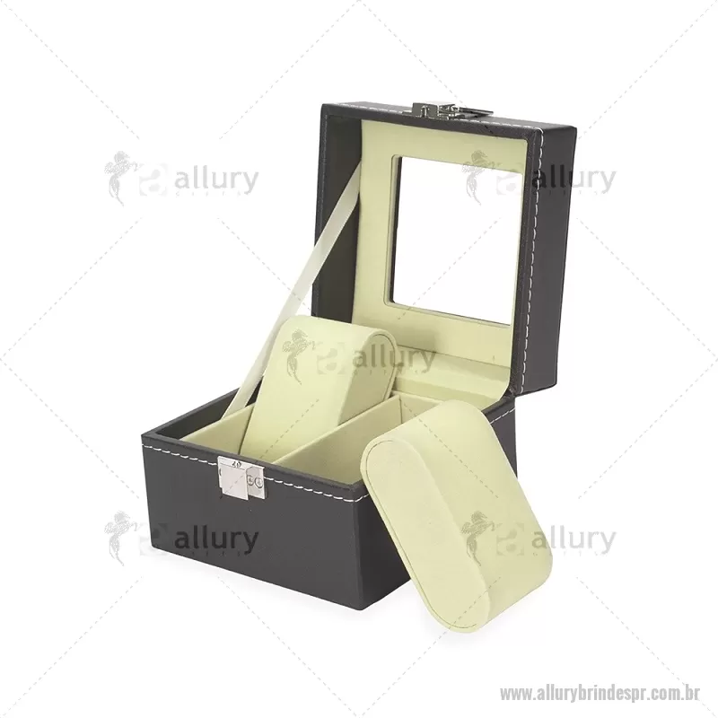 Porta relógios com acabamento externo em couro sintético à base de PVC e interior revestido em veludo macio. Possui duas divisórias com almofadas removíveis para melhor acomodação das peças, tampa com visor em vidro que facilita a visualização e trava de segurança que garante o fechamento adequado do estojo. Ideal para organizar e proteger relógios com elegância. - - ALLPRPREL001