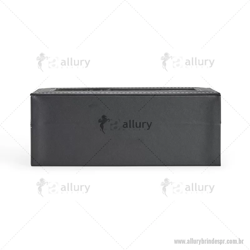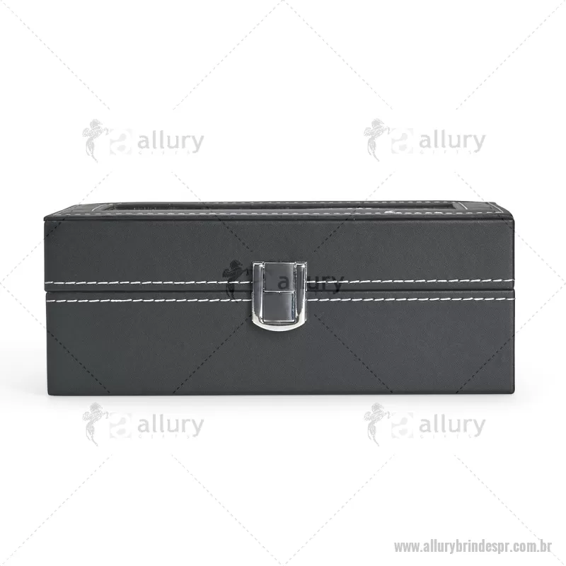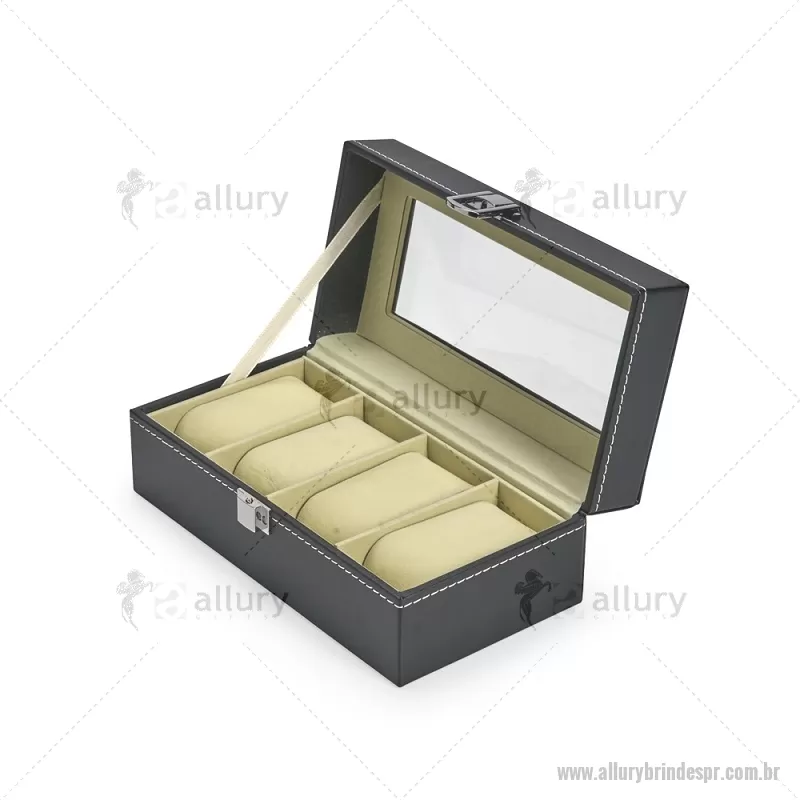 Porta-relógios com acabamento em couro sintético em PVC e interior forrado em veludo. Possui quatro compartimentos com almofadas de espuma removíveis, visor superior em vidro e trava de segurança, ideal para organizar e proteger relógios com elegância. - - ALLPRPREL003