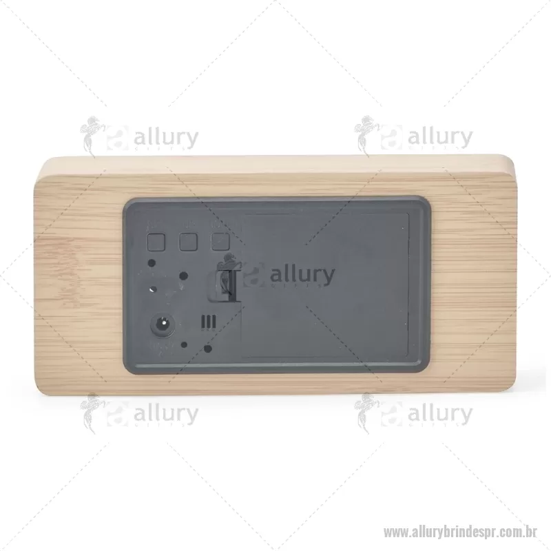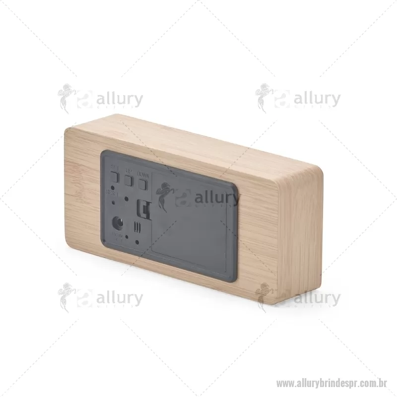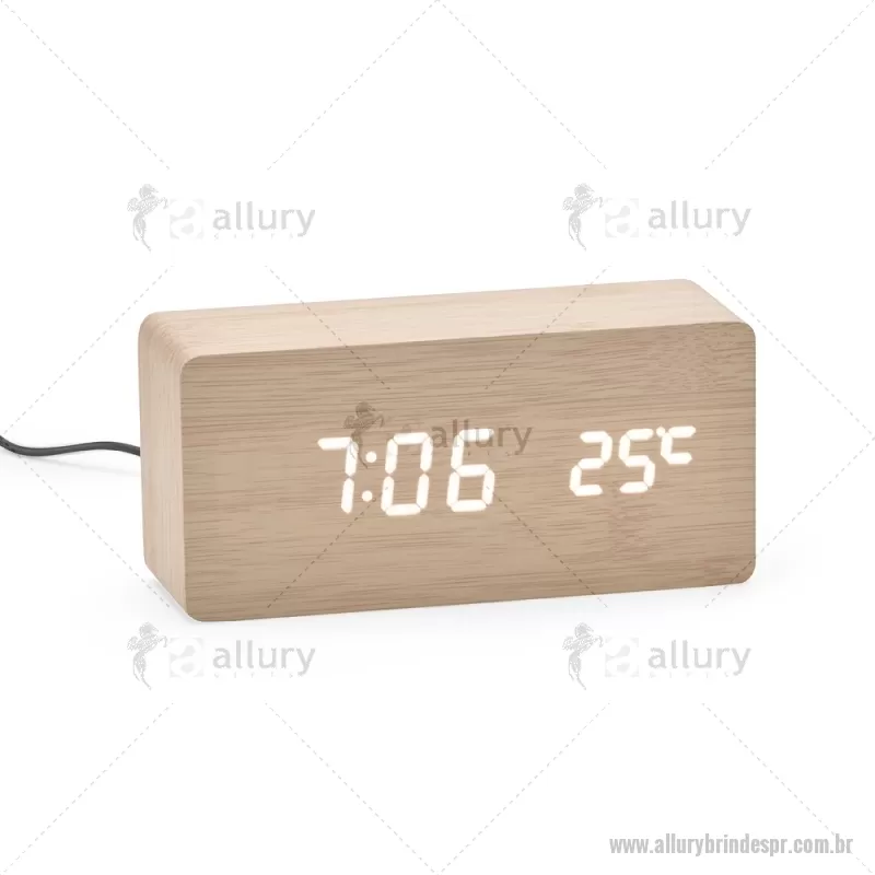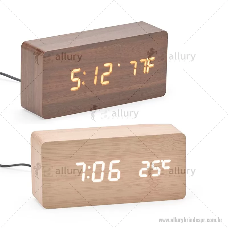 Relógio despertador em madeira com display LED, que combina design elegante e tecnologia moderna. Exibe horas, data e temperatura ambiente, além de permitir a programação de até três alarmes com diferentes configurações. Pode ser alimentado por 4 pilhas AAA (não inclusas) ou por cabo USB DC 5V, que acompanha o produto, oferecendo praticidade para o uso diário. - - ALLPRREL023