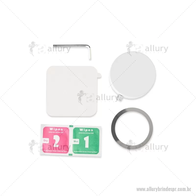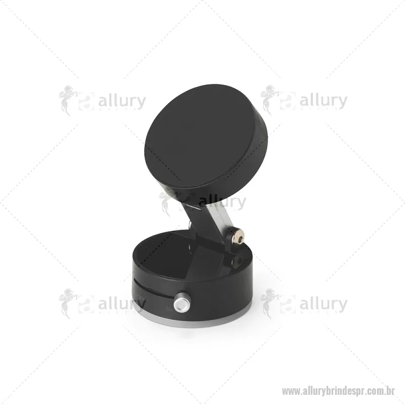 Suporte magnético para smartphones feito em plástico, com ajuste de inclinação e ventosa retrátil acionada por chave seletora para fixação em superfícies lisas. Permite uso do aparelho na vertical ou horizontal por meio do encaixe magnético, compatível com celulares com função magnética ou com anel adaptador. Acompanha dois anéis magnéticos adesivos, um adesivo em policarbonato, kit de limpeza e chave Allen. - - ALLPRTEC536