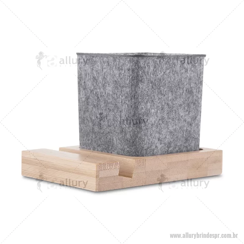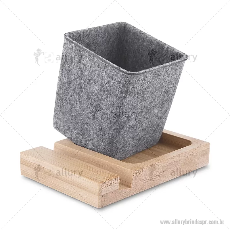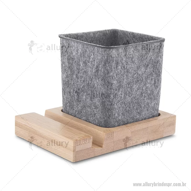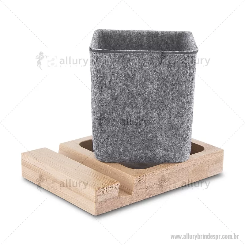 Porta objetos/smartphone em feltro e bambu Porta-objetos em feltro reciclado com suporte para celular em bambu. Prático e versátil, ideal para organizar canetas, lápis, marcadores e manter a mesa de escritório sempre funcional e elegante. Peso do Produto: 0,112kg Dimensão do Produto: (1,7x11,7x8,5cm) (Base em bambú) Dimensão do Produto: 8x6,5x6,5cm (Porta Caneta) - - ALLPRPC021